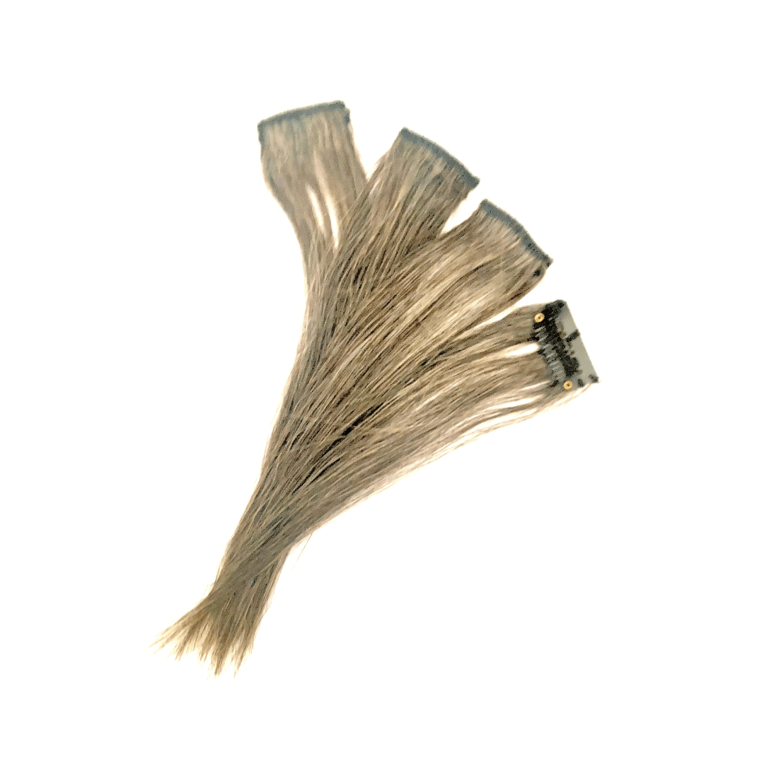 Introducing a smooth convenient way to transform your hair colour Salt & pepper brown highlight clip-in hair extensions transform your look instantly without damaging your hair! These clip-in highlights are made of 100% Remy human hair, which blends easily with your natural hair and looks completely natural.